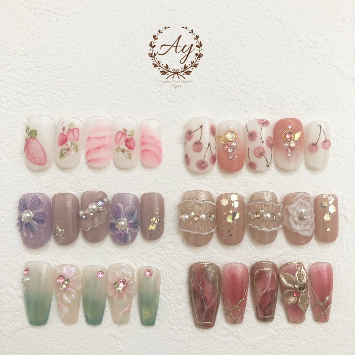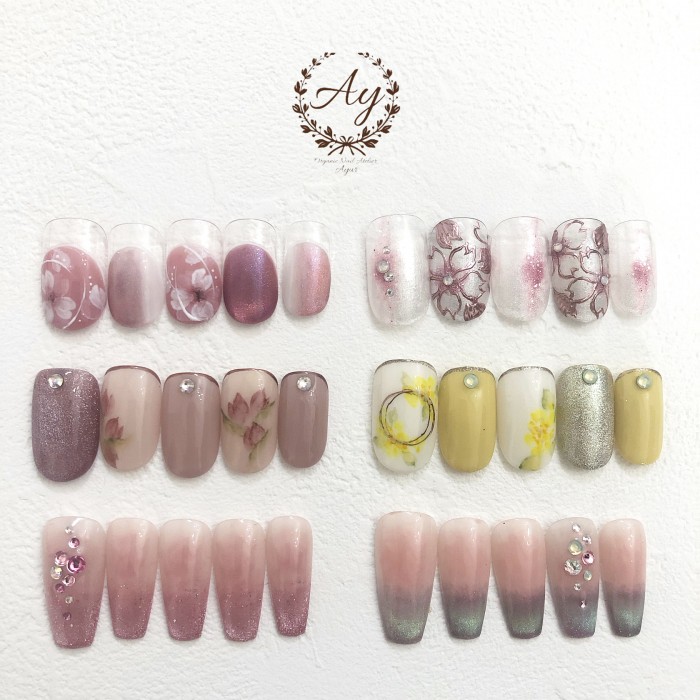 ※各コース→ベースを生かしたお直し及びオフ、爪先端の整形、亀裂補修、ベースジェル、フォルム形成ジェル、補強ジェル、ジェルネイルアート、ストーンなどのパーツ埋め込み、トップジェル、オーガニックアロマオイルの保湿が含まれており、1つのコースで持ちの良いジェルネイルに仕上がります。